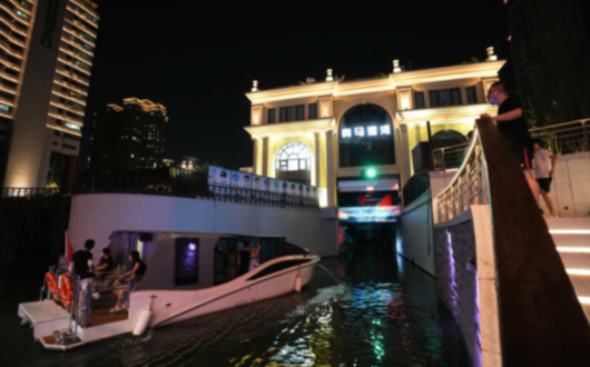 7月16日,市民在北京市朝阳区亮马河上乘船游览。