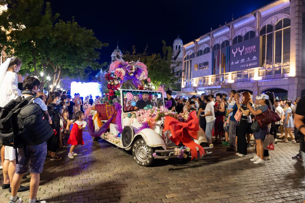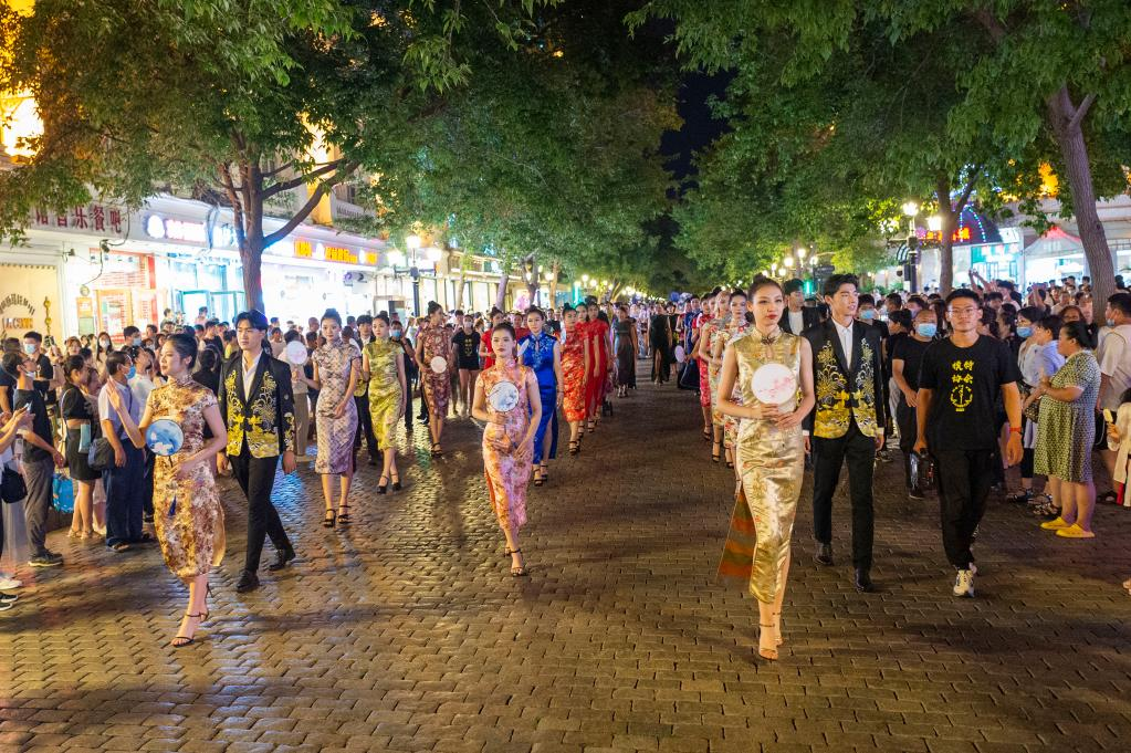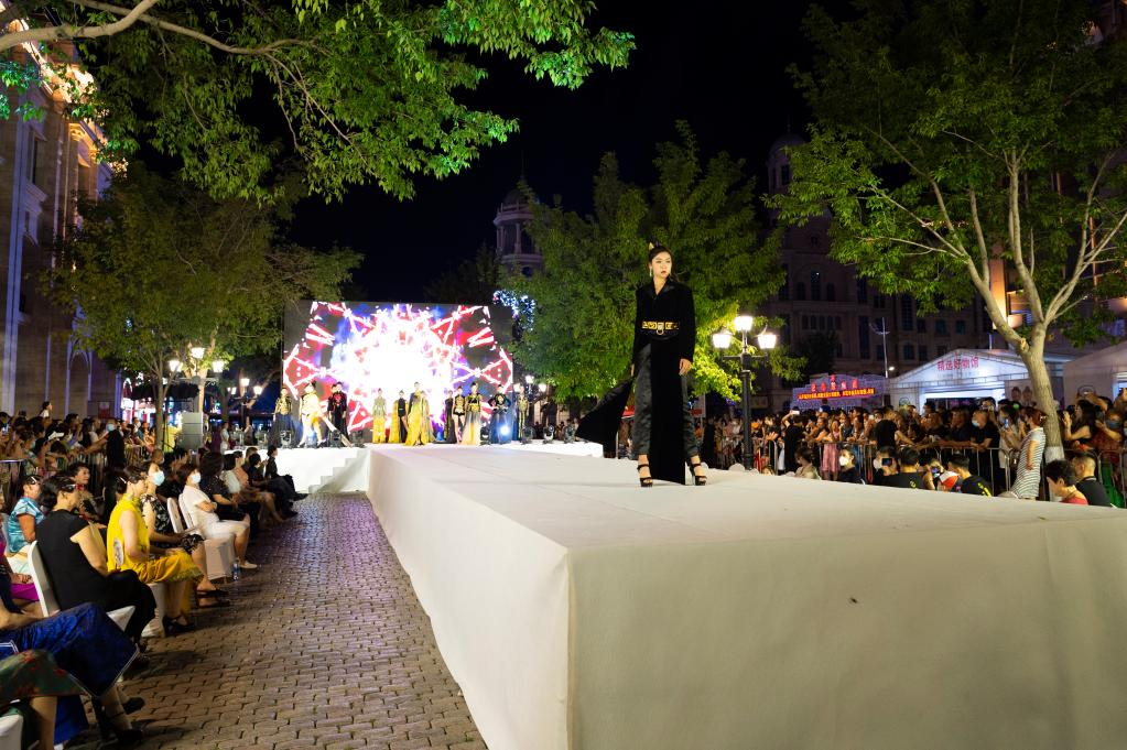 8月5日,在哈尔滨市中央大街,模特在T台上表演。