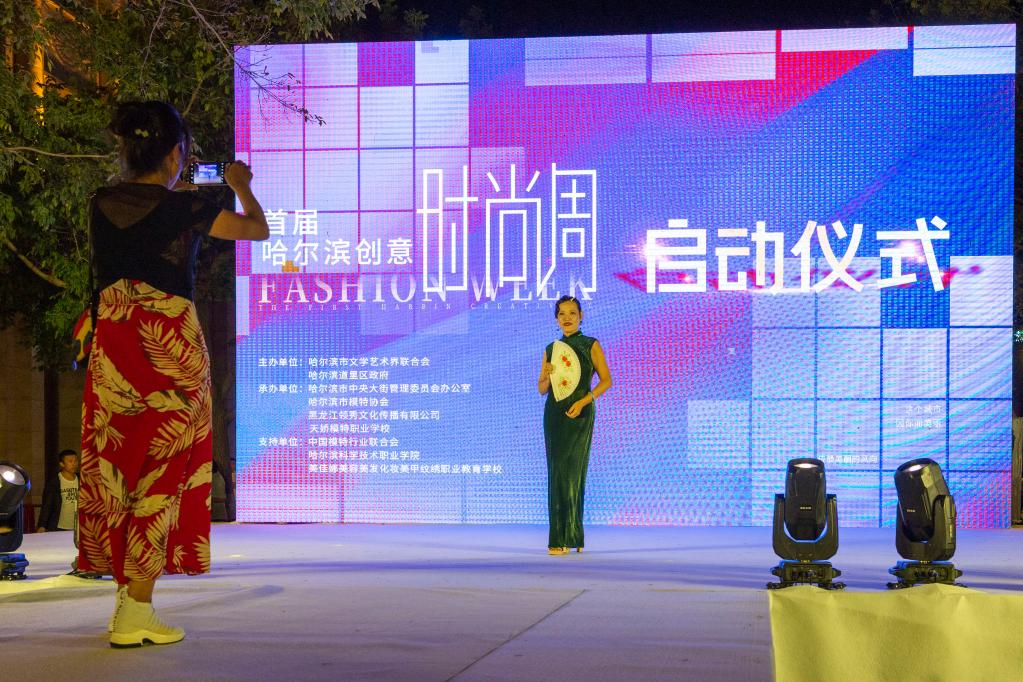 8月5日,在哈尔滨市中央大街,模特在T台上留影。