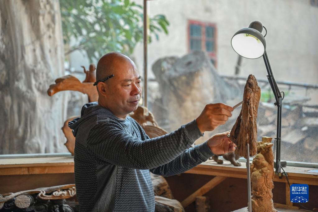 12月9日,陈志华的学徒在莆田市秀屿区根艺博物馆内制作根雕。