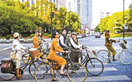 上海,四川中路与南京东路交叉路口,红灯亮起,复古骑行自行车车队停下等待。几位大约六十来岁的叔叔、阿姨正准备过马路,却被一群青年男女的独特装扮吸引了目光。有人忍不住停下观看、拍照,也有人上前询问、夸赞:“你们是在拍电影吗?”“你们穿得真好看!”