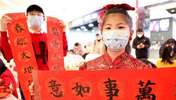 1月14日,山东省青岛西海岸新区灵山岛省级自然保护区兴港路社区的青少年展示自己写的春联。