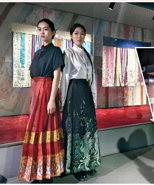穿着马面裙,观赏马面裙文物,昨天,上海视觉艺术学院00后大学生徐佳莹与文物“同框打卡”,“我平时很喜欢在网上淘中式服装,觉得穿上非常有韵味。”