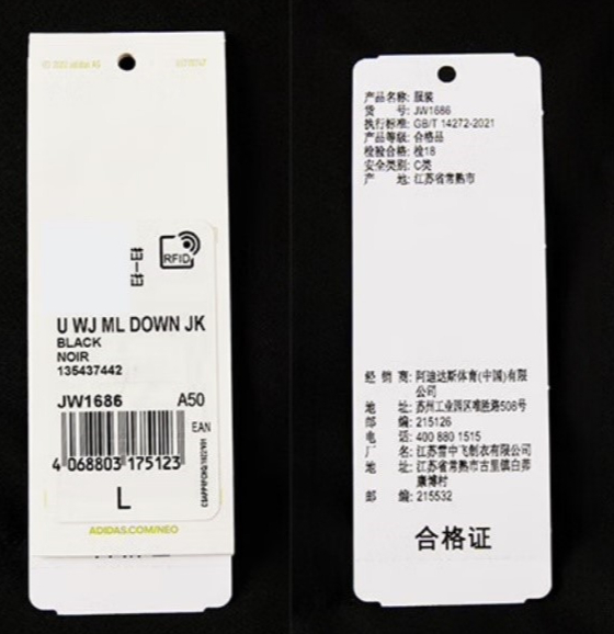 记者在阿迪达斯京东自营旗舰店看到,店内的多款羽绒服吊牌图片显示,产品经销商为阿迪达斯体育(中国)有限公司,制造厂名为江苏雪中飞制衣有限公司。此外,记者还发现,店内一款价格近900元的短款宽松羽绒服填充鸭绒180g,绒子含量为80%,标注的厂商为嘉兴广越服装有限公司。