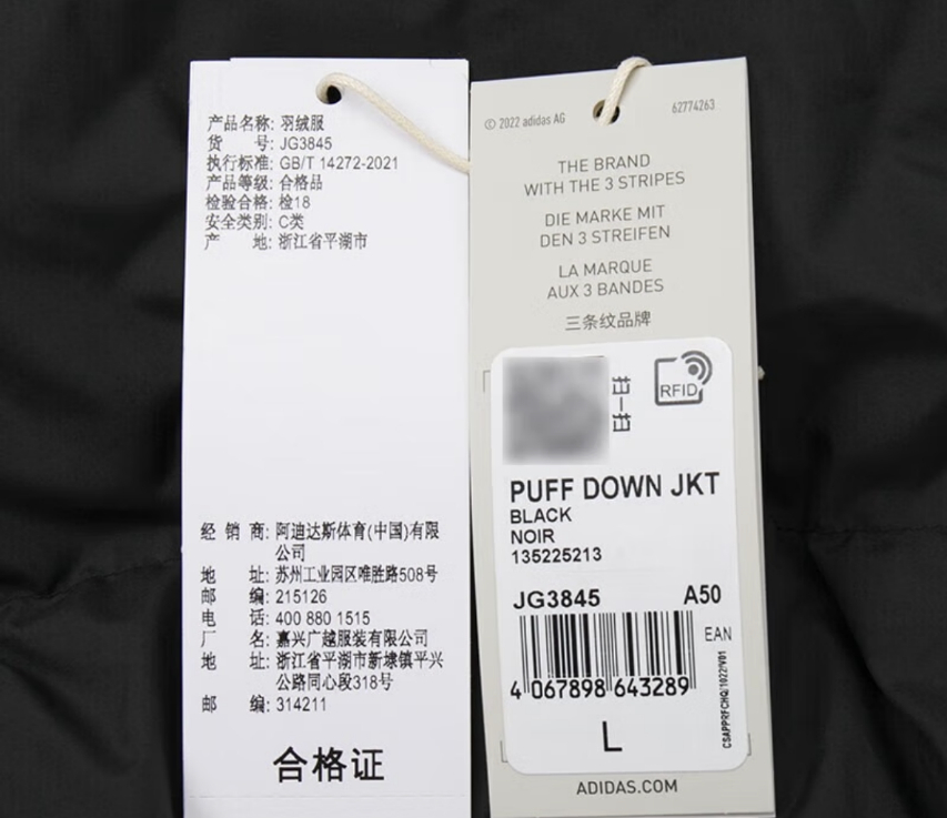 阿迪达斯羽绒服吊牌。(图片截自阿迪达斯京东自营店)
