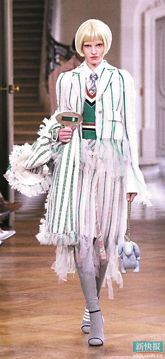 还有帽子,斜戴露出半边额头或堆叠佩戴;耳饰单边佩戴或选长短不一的耳坠;腰带斜挎腰间或多条叠搭——这些“叛逆”的用法都为营造不经意的失序感贡献力量,于整体造型的细节中挑战严肃审美。(记者梁彧)