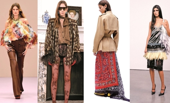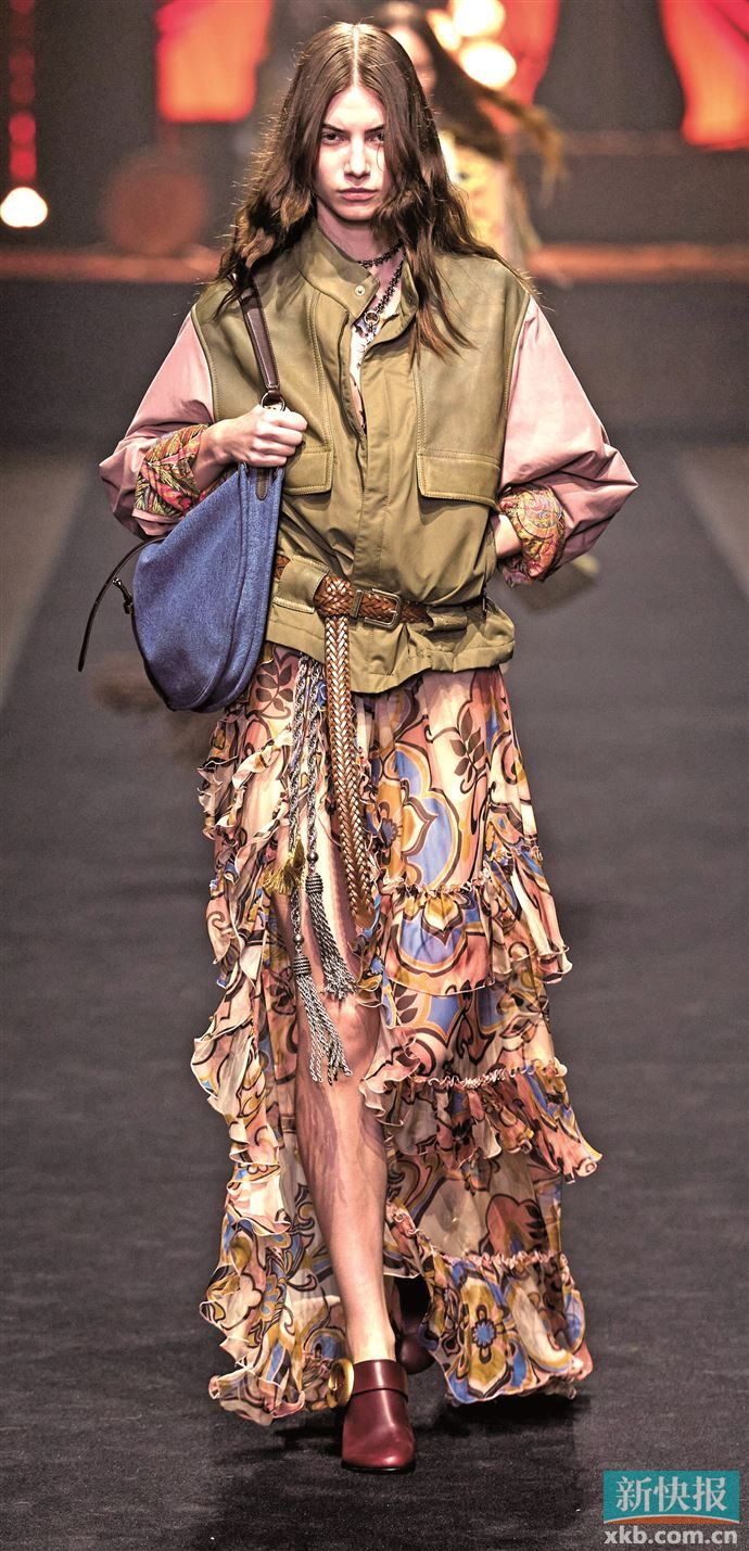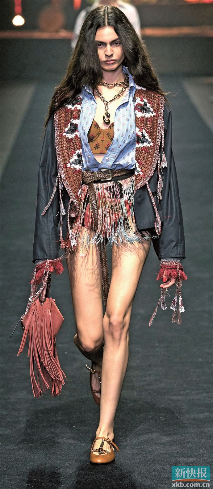 浪漫波嬉中的摇滚民族造型并非直白的朋克叛逆,而是将传统民族元素通过斑驳做旧、文字层叠与暗黑色彩等设计手法巧妙融入摇滚乐的反叛基因,打破民族风情的固有印象,塑造不羁的波西米亚风格。它汲取世界各地民族服饰的精华如印度刺绣、摩洛哥几何图案、墨西哥色彩碰撞等,再融入摇滚风格的利落剪裁与材质对比,形成柔中带刚的独特张力。