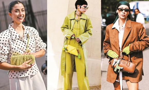 担心大面积嫩芽绿不好驾驭,小面积嫩芽绿点缀便成为让造型出彩的至佳选择。重点是要放在色彩张力上,选款式简约、避免过于繁复的单品,否则会显杂乱,影响整体造型的美感。